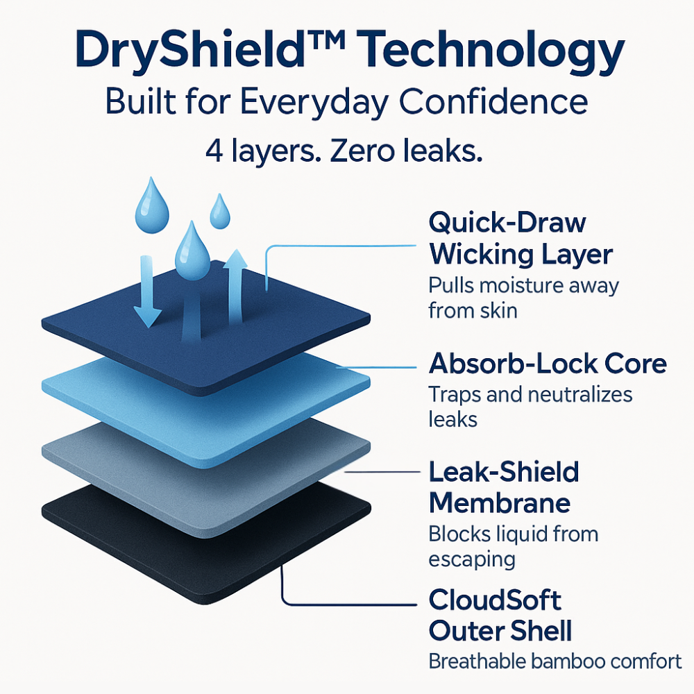 Each pair uses our DryShield™ 4-Layer System, combining bamboo-derived comfort with high-performance protection that absorbs, locks in moisture, and prevents leaks without bulk.